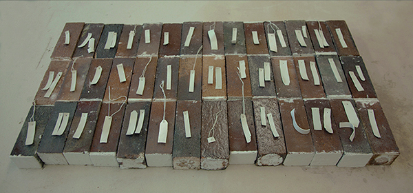 empathy project 2023-ongoing porcelain data tags, string, kiln brick